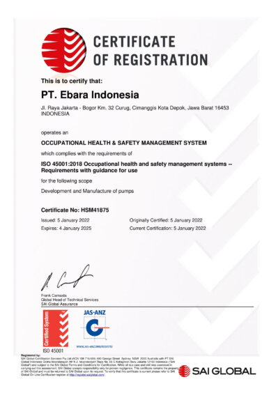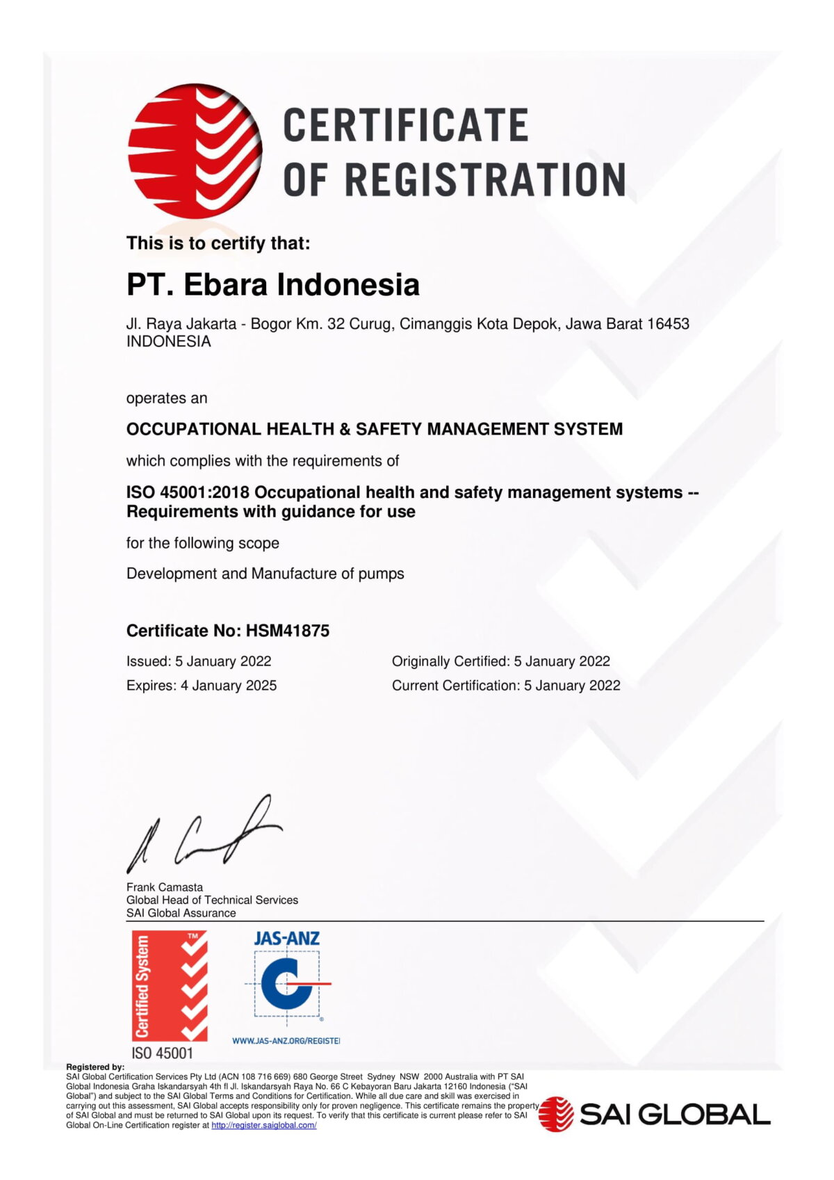 PT. Ebara Indonesia telah memperoleh sertifikat Sistem Manajemen Kesehatan dan Keselamatan Kerja ISO 45001 dan Sistem Manajemen Lingkungan ISO 14001 setelah sebelumnya telah memperoleh Sertifikat Sistem Manajemen Mutu ISO 9001 di tahun 2001.