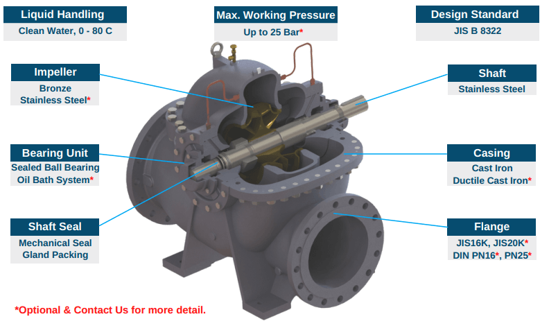 - Axially split casing allows the easy removal of the top casing for inspection and service.