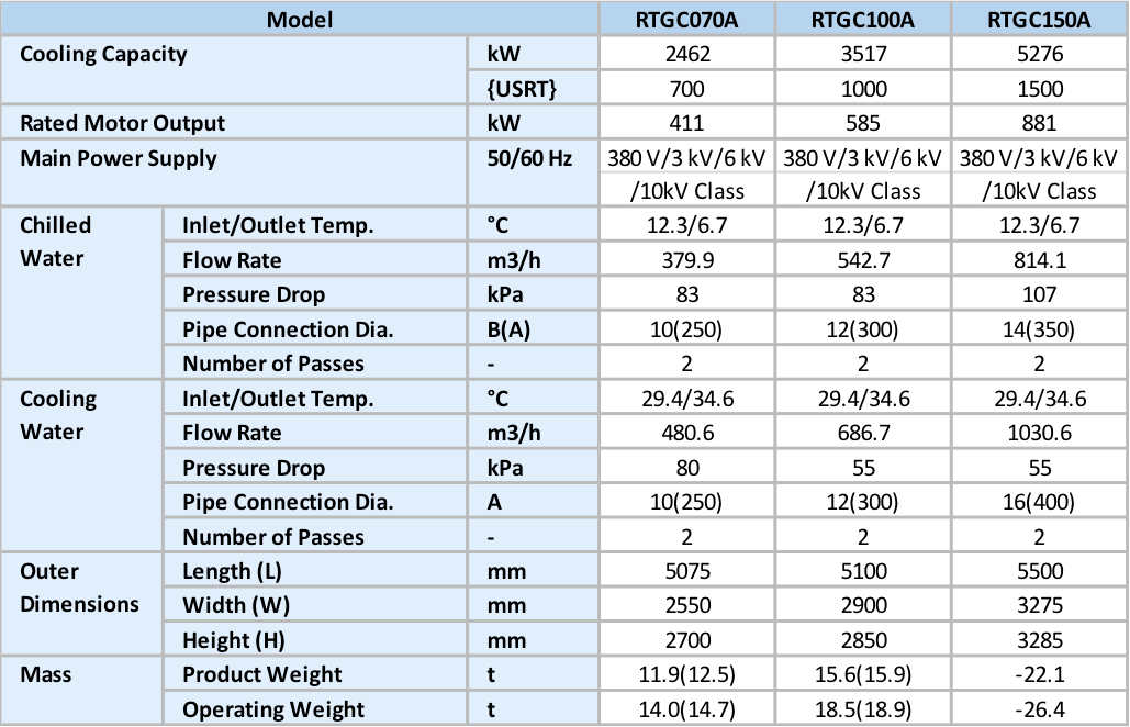 • Using Eco-friendly Refrigerant, HFC-134a Cooling Capacity: 1934 to 5627kW{550 to 1600 USRt} COP: 6.0 at AHRI Condition Sixteen standard models with a cooling capacity of 550 to 1600 USRt are available.